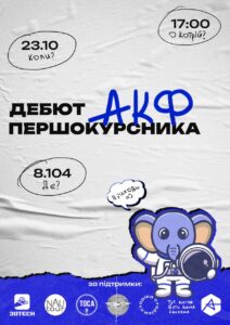 23 жовтня 2023 р. відбувся конкурс «Дебют першокурсника АКФ ». На ньому талановиті першокурсники порадували присутніх жартами, піснями, танцями. Свої таланти продемонстрували чотири команди: “Антонов”, “Кабмін”, “Актори погорілого театра” “Хто крайній”. Були проведені декілька конкурсів. Дякуємо всім командам та їх Далi