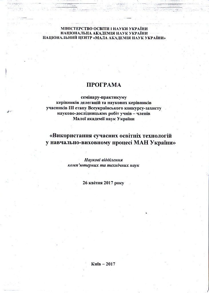 26 квітня в Малої академії наук України пройшов семінар-практикум «Використання сучасних освітніх технологій у навчально-виховному процесі МАН України», на якому виступив заступник директора НН АКІ Ільєнко Сергій Сергійович. В своїй доповіді він розповів про головні напрямки роботи і підготовки кадрів в Навчально-науковому Аерокосмічному інституті.