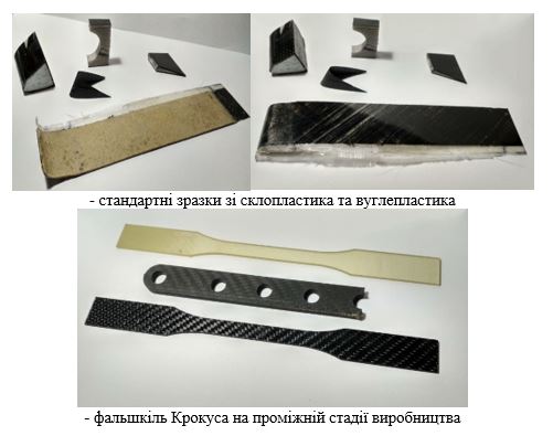 – колекція обрізків від процесу виробництва повністю композиційного БпЛА “Крокус” в Віражі (фрагменти закінцівки та носка крила зі стінкою, обшивки носка, обшивки крила (зовні та зсередини), поперечного силового набору крила – нервюри)