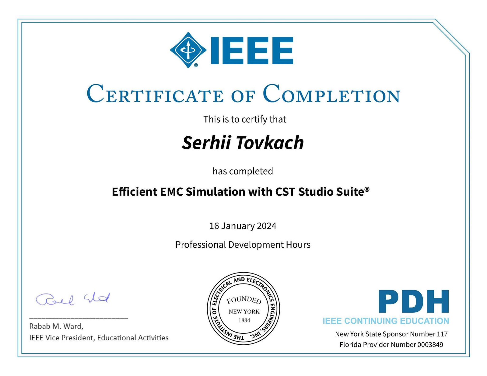 В рамках програми дослідження IEEE Spectrum (USA) доцент кафедри автоматизації та енергоменеджменту Аерокосмічного факультету ТОВКАЧ Сергій Сергійович 16 січня 2024 року проходив підвищення кваліфікації в обсязі (Professional Development Hours) за напрямом ” Efficient EMC Simulation with CST Studio Suite / Ефективне моделювання EMC за допомогою середовища CST Studio Suite” та отримав сертифікат.