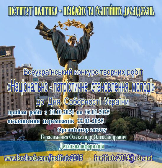 Інститут політико-правових та релігійних досліджень з нагоди відзначення Дня Соборності України проводить Всеукраїнський конкурс творчих робіт «Національно-патріотичне становлення молоді». Пріоритетні напрямки Конкурсу: