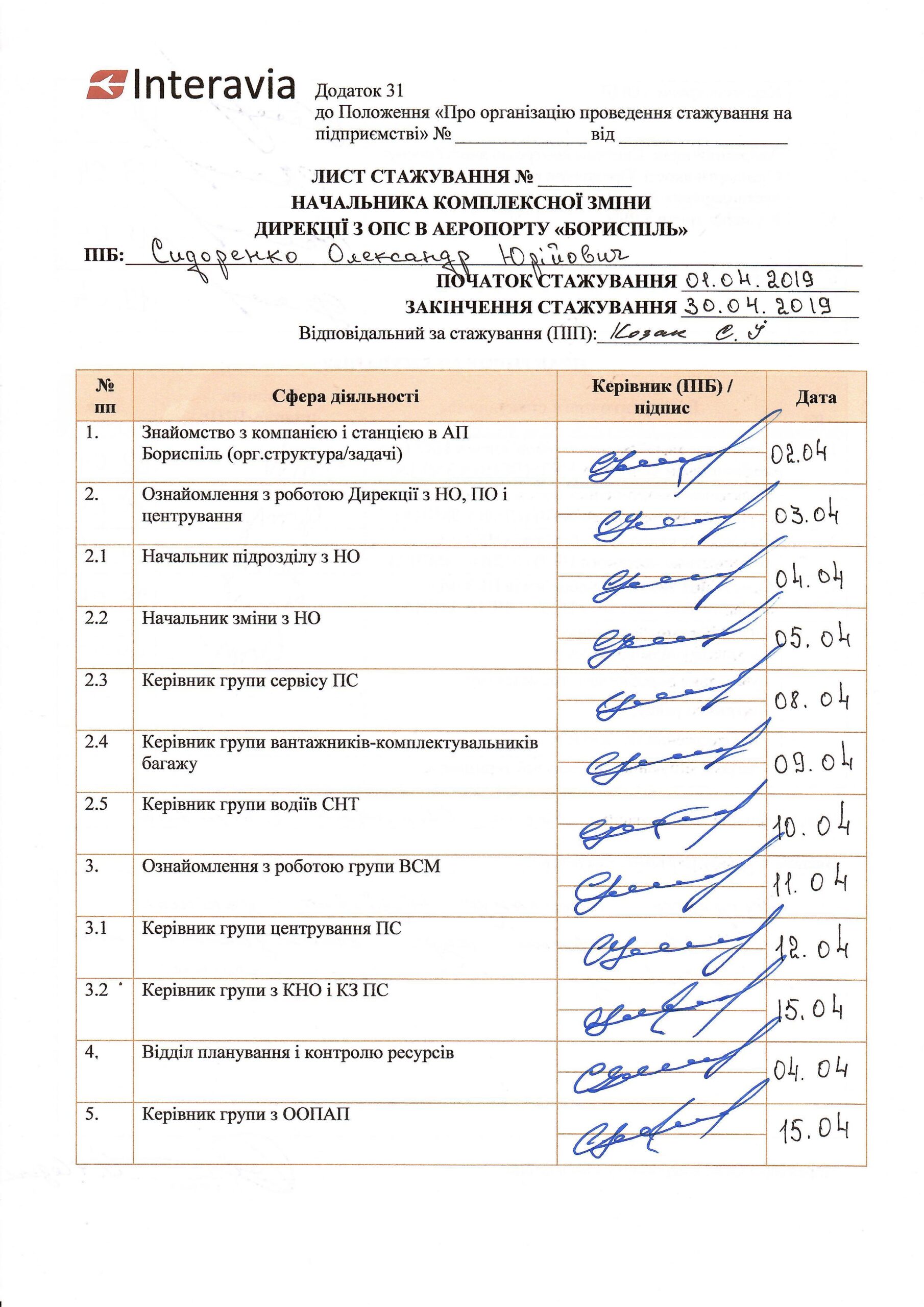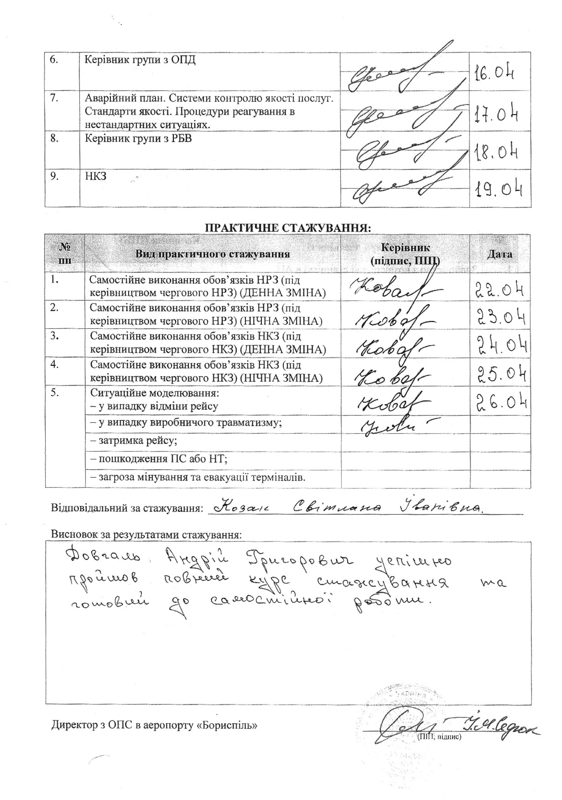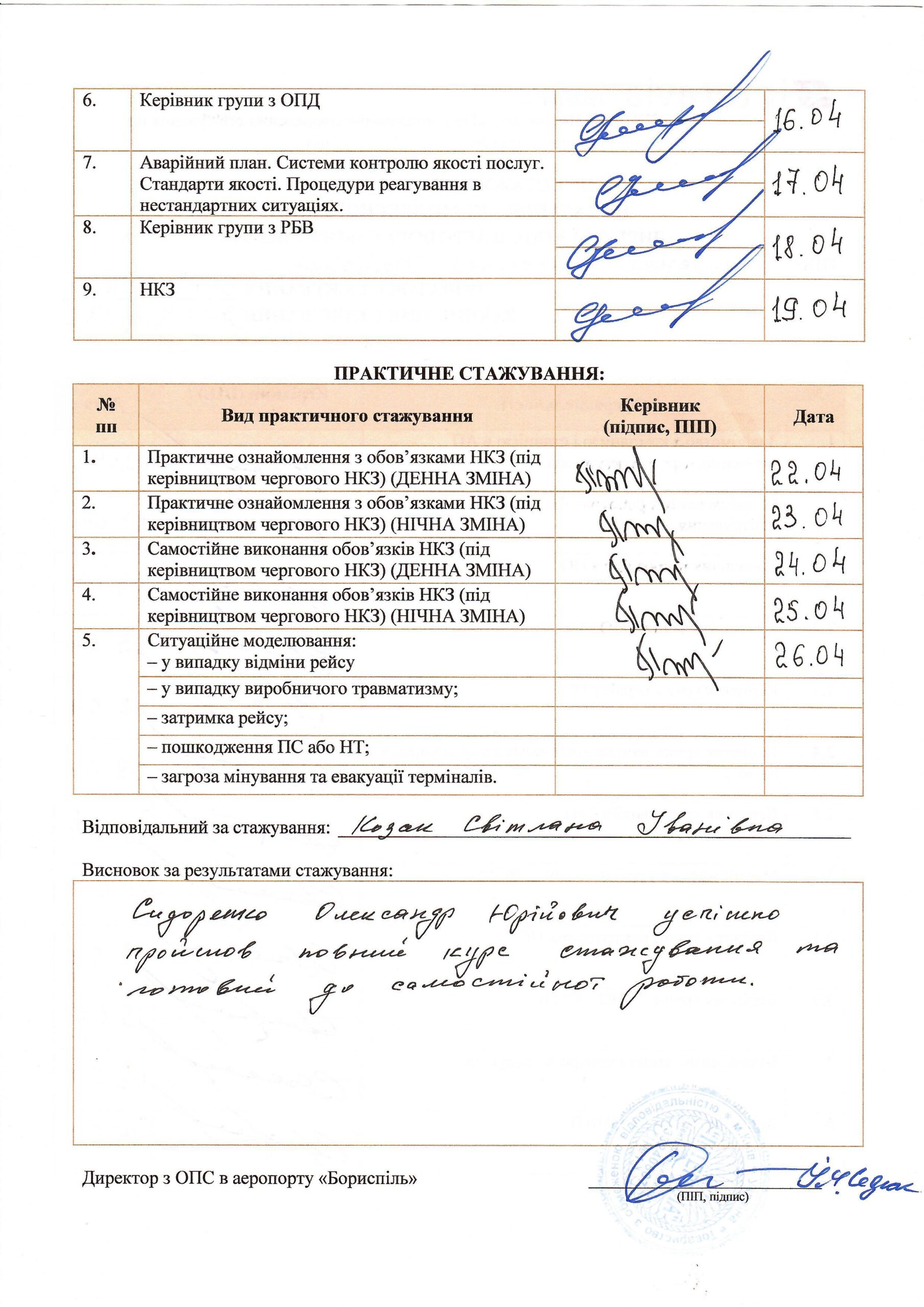 У 2011 році пройшов підготовку у ТОВ «Свіспорт Україна» з організації роботи хендлінгової компанії у сучасному аеропорту. Кожні п’ять років проходить підвищення кваліфікації у ТОВ «Інтеравіа» (останнє у 2020 році).