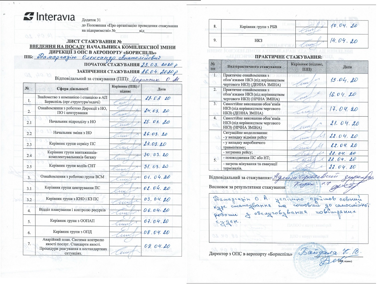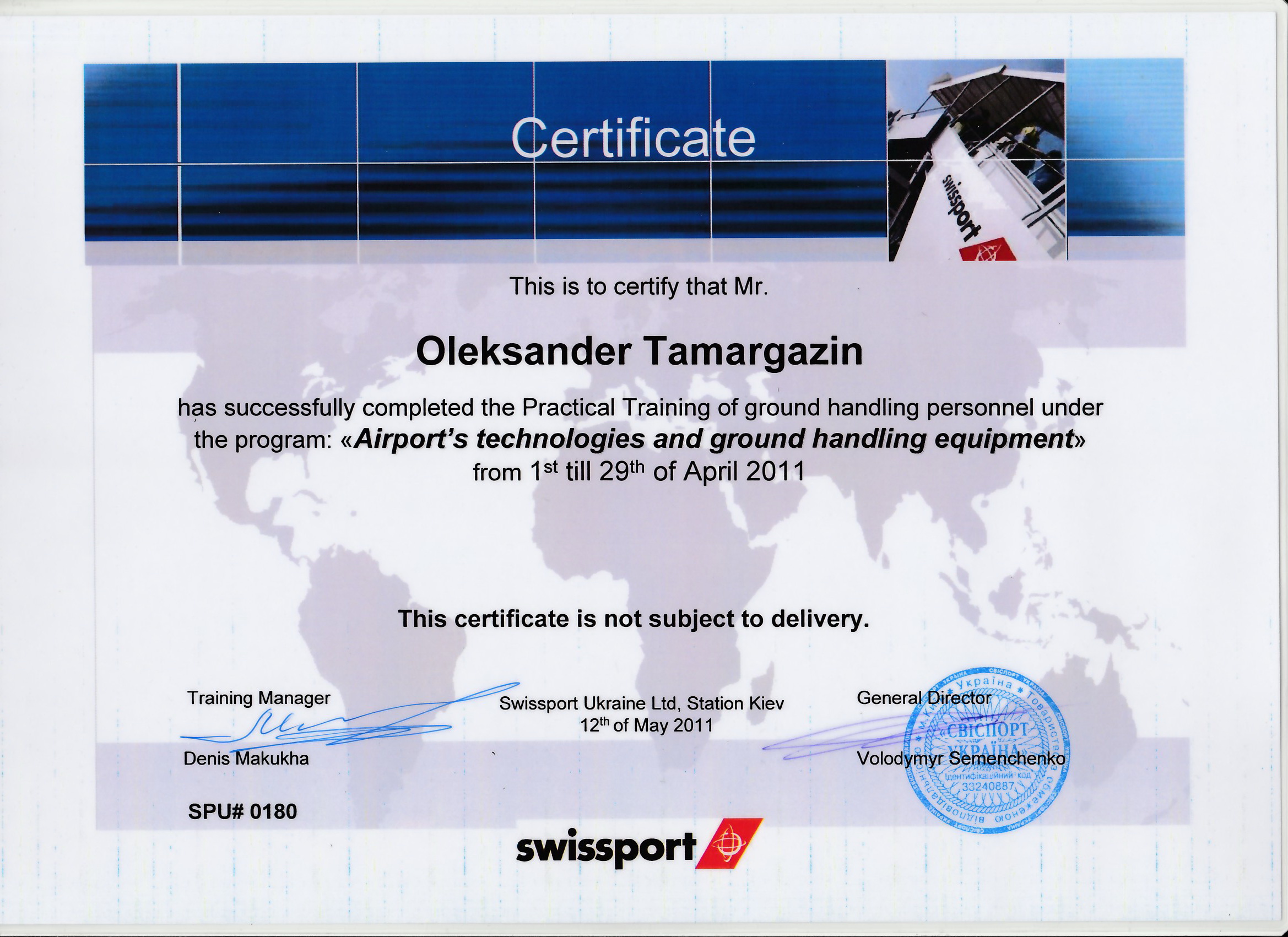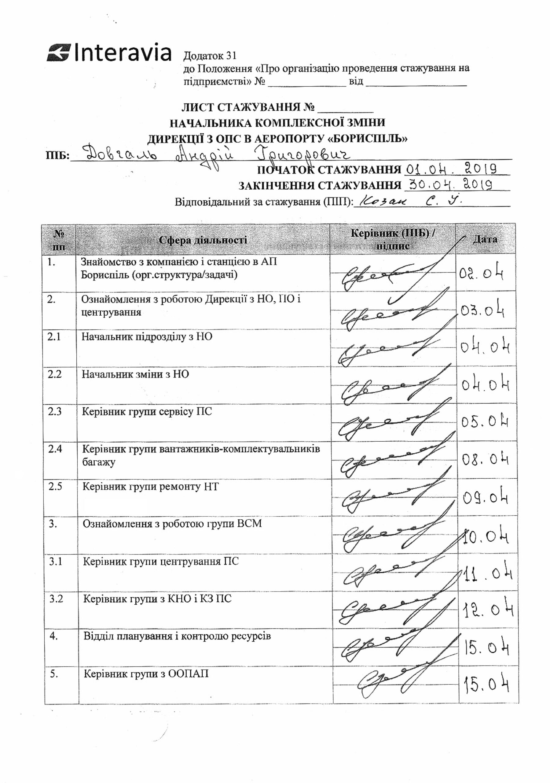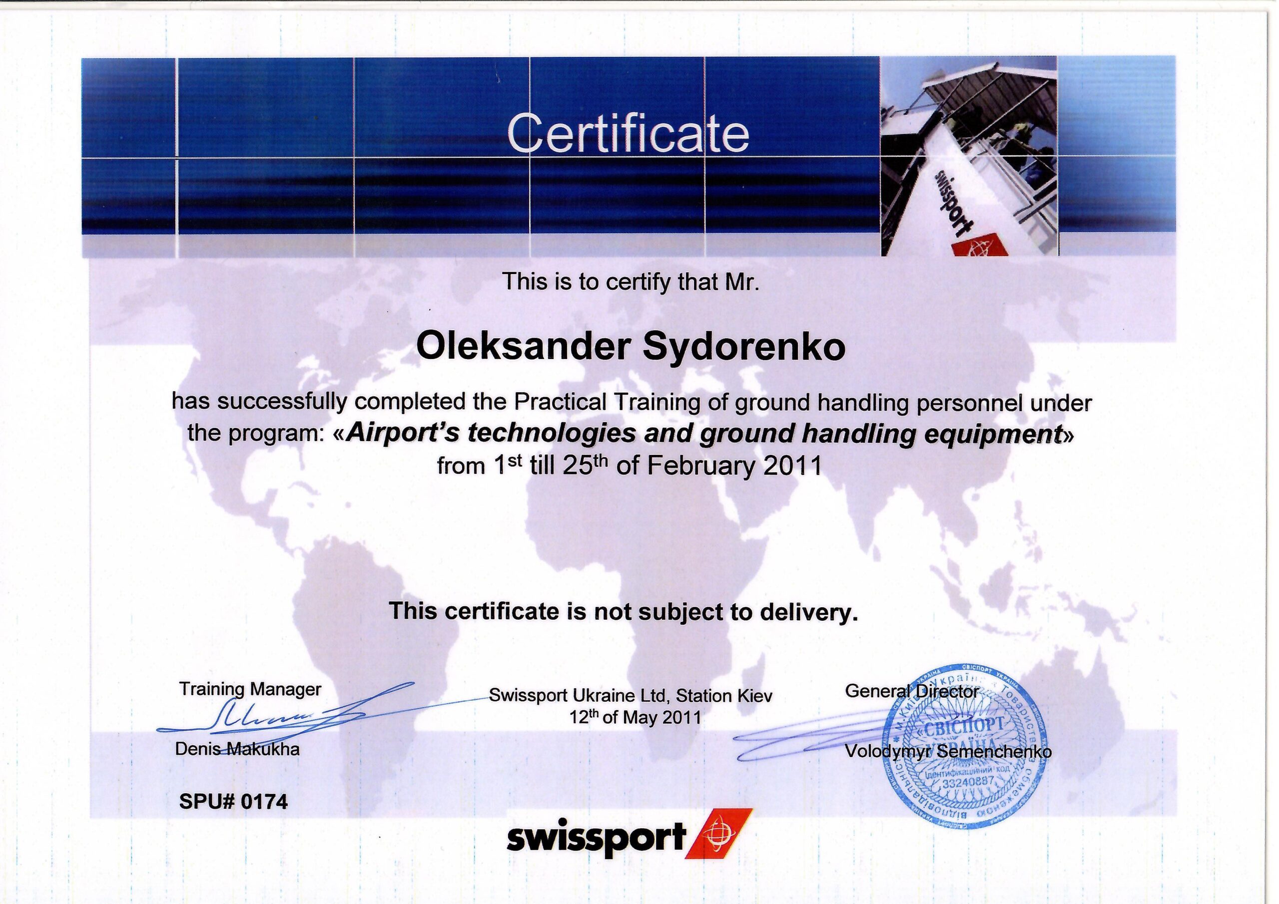 У 2011 році пройшов підготовку у ТОВ «Свіспорт Україна» з організації роботи хендлінгової компанії у сучасному аеропорту. Кожні п’ять років проходить підвищення кваліфікації у ТОВ «Інтеравіа» (останнє у 2020 році).