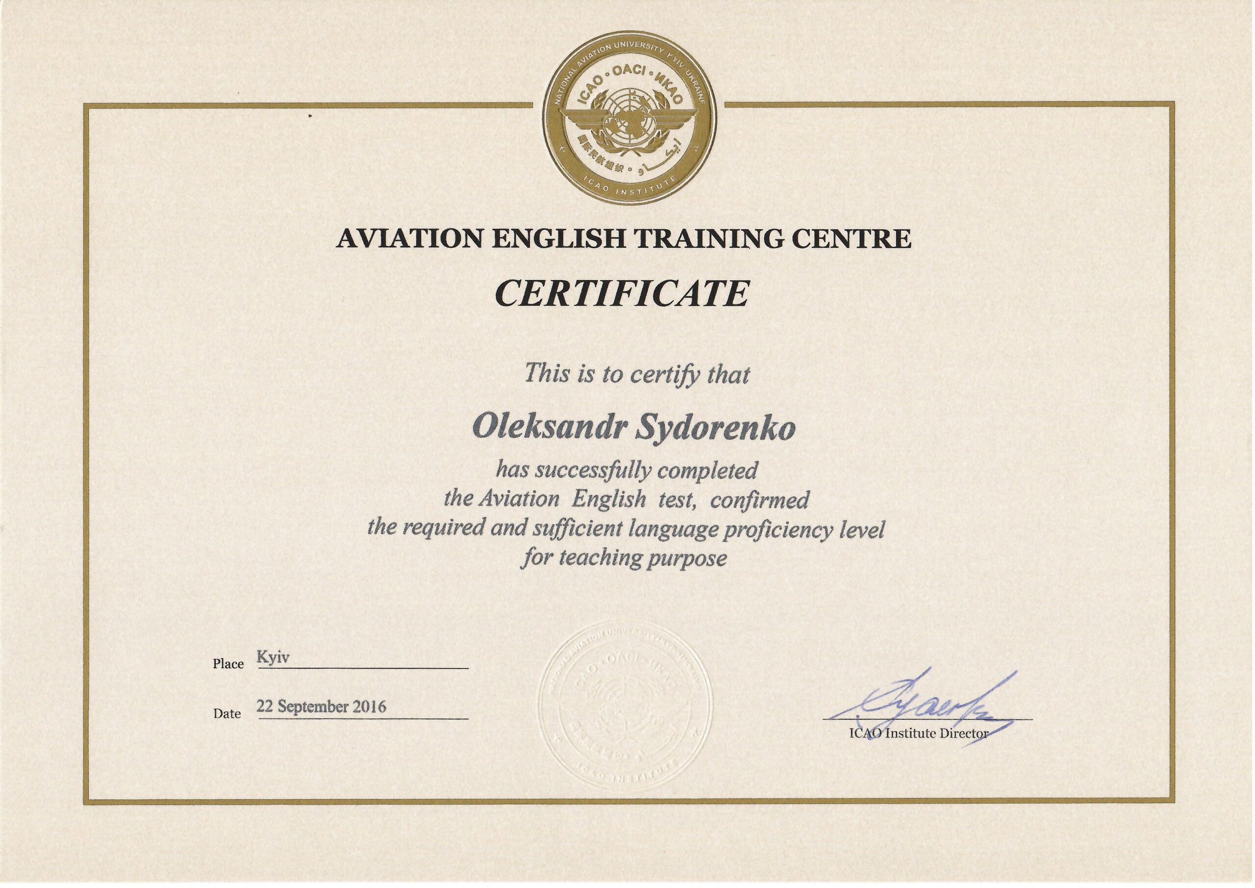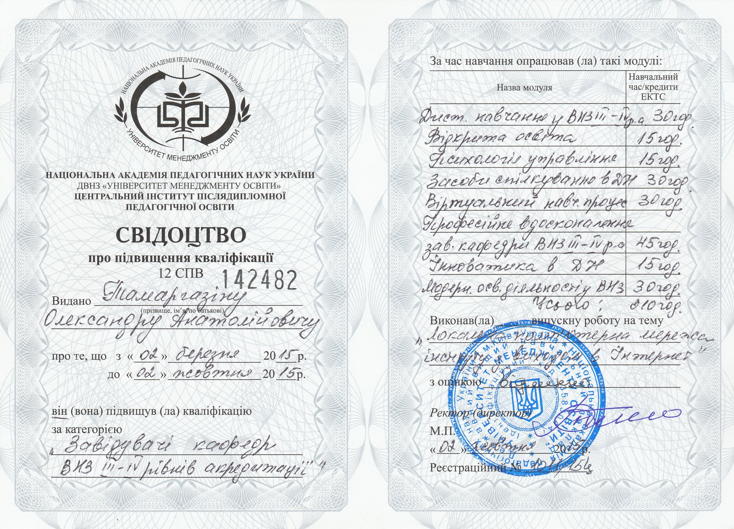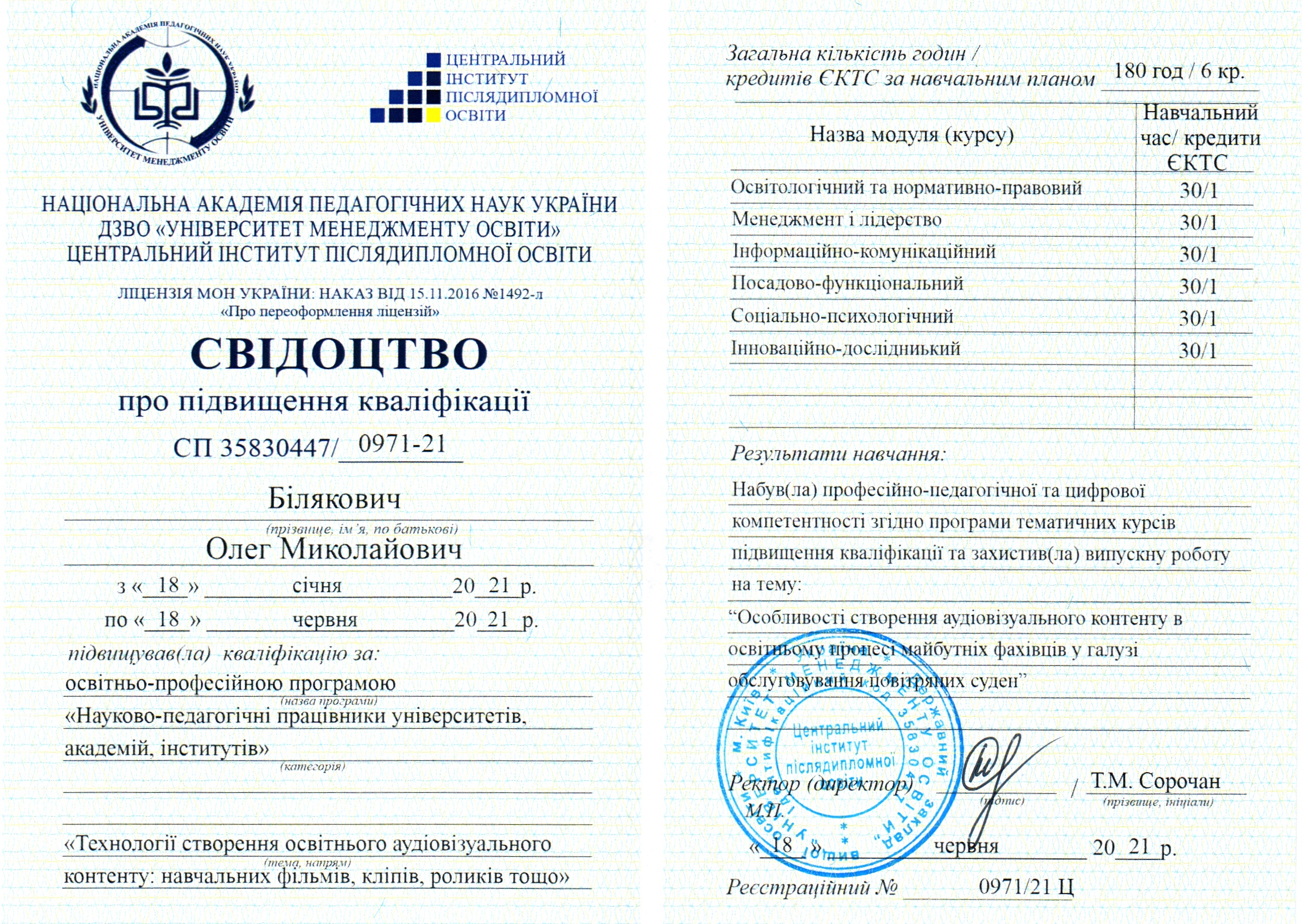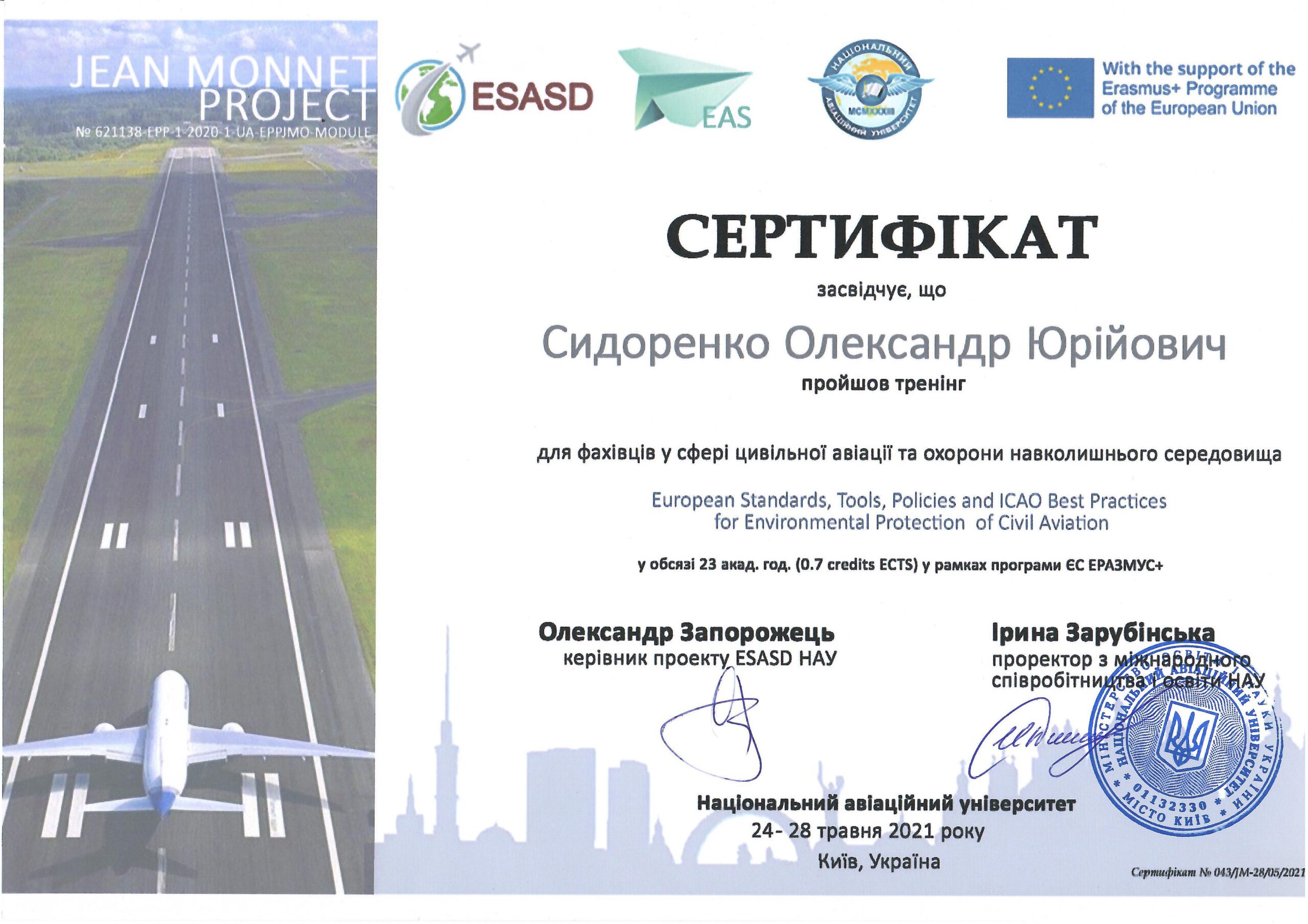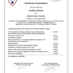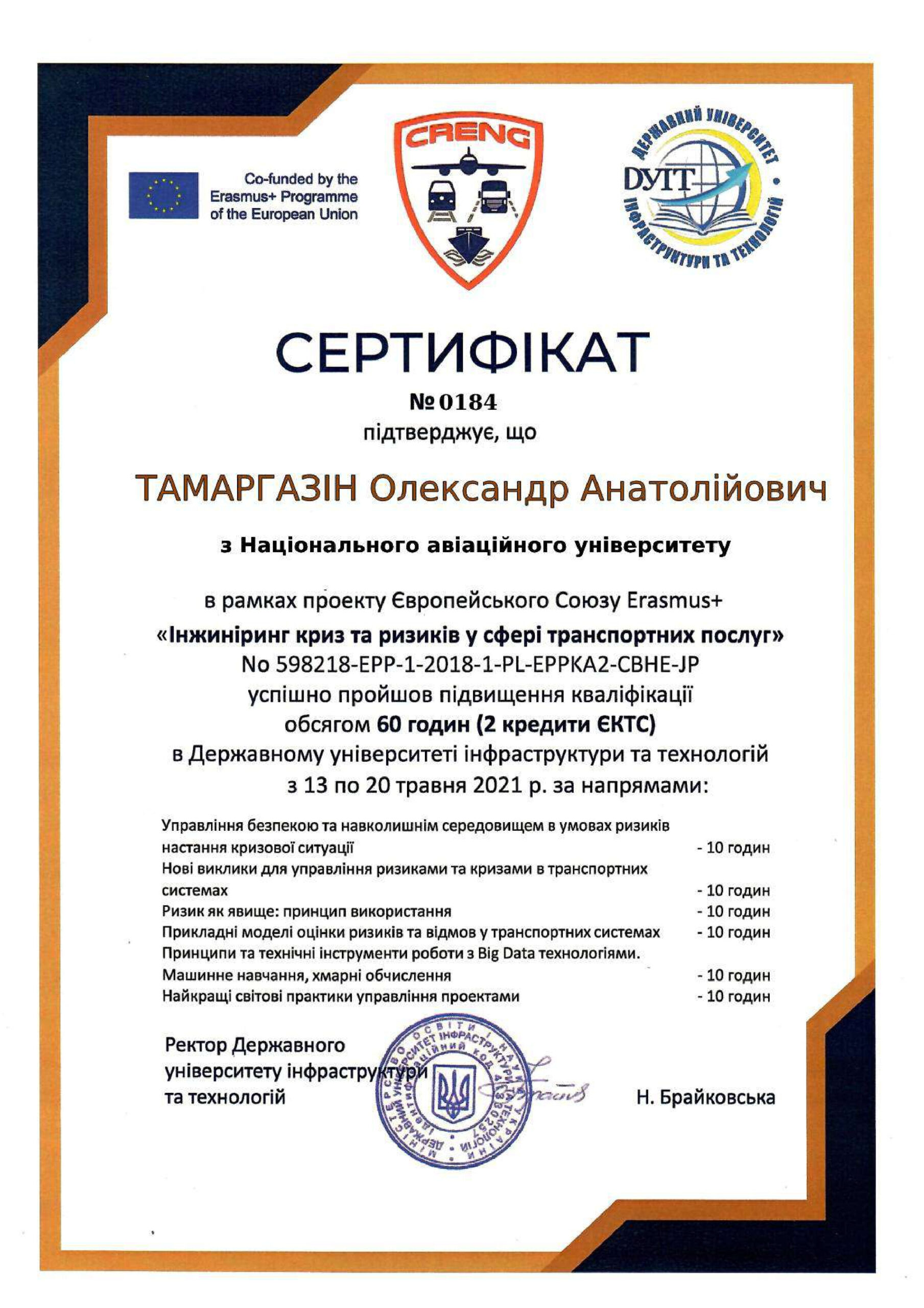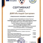 Отримав свідоцтво на право викладання англійською мовою у 2005 р., пройшов і успішно закінчив курс практичних тренувань за програмою «Технологій аеропортів та наземного обладнання» (компанія «Swissport Ukraine Ltd») у 2011 р., (компанія «Інтеравіа») 2015 р., (компанія Інтеравіа») 2019р., пройшов і успішно закінчив курс підготовки та отримав сертифікат «Внутрішнього аудитору системи менеджменту якості» (компанія «Bureau Veritas»), пройшов і успішно закінчив курс підготовки за програмою «Системи управління безпекою» в інституті ІКАО НАУ, пройшов і успішно закінчив курс підготовки «Інструктора» за програмою «Система управління безпекою» в інституті ІКАО НАУ, отримав сертифікат ICAO з авіаційної англійської мови, закінчив курс підготовки «Упровадження інформаційно-комунікаційних технологій та дистанційного навчання в освітній процес» в Національній академії педагогічних наук України в 2021 р.