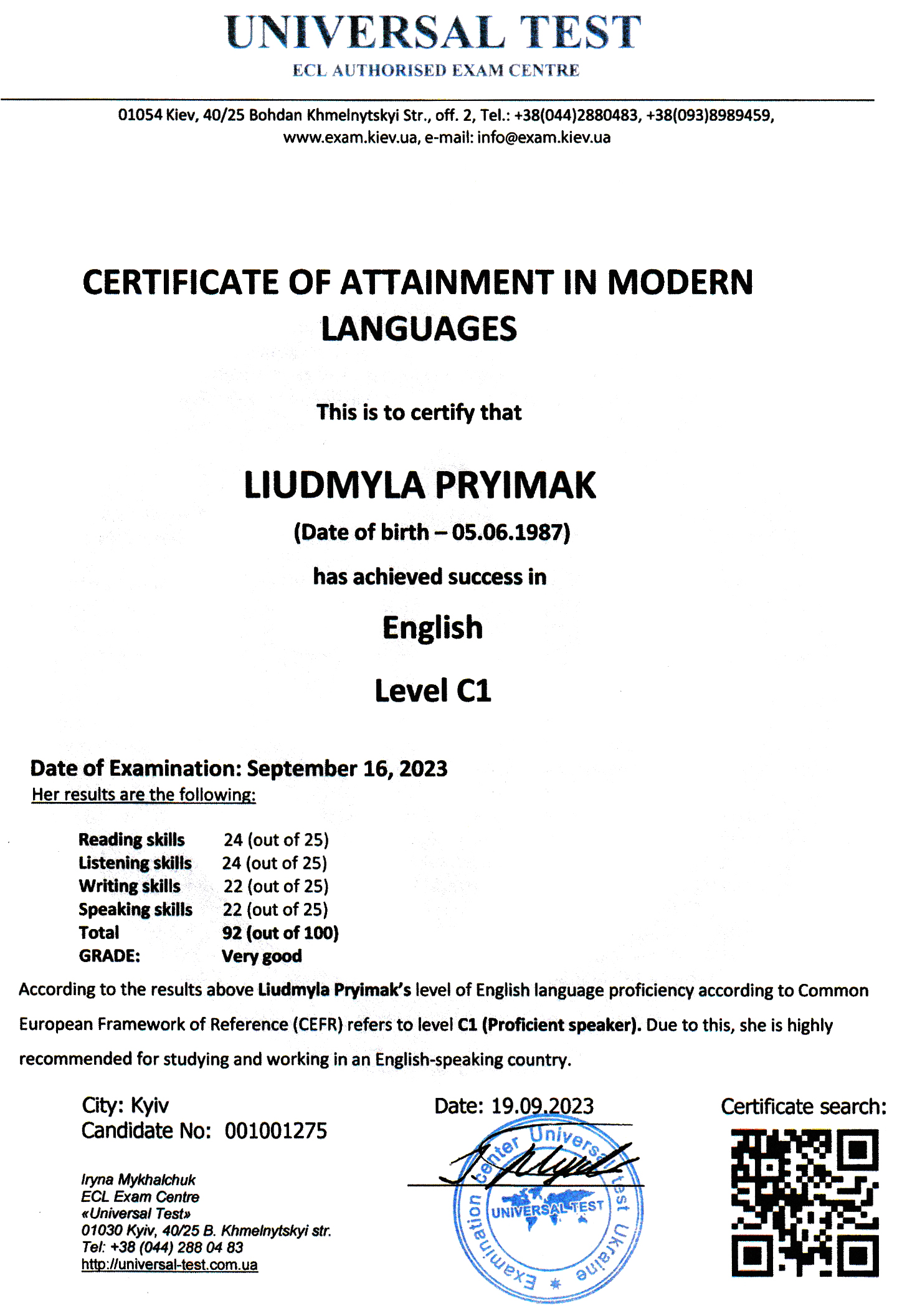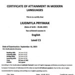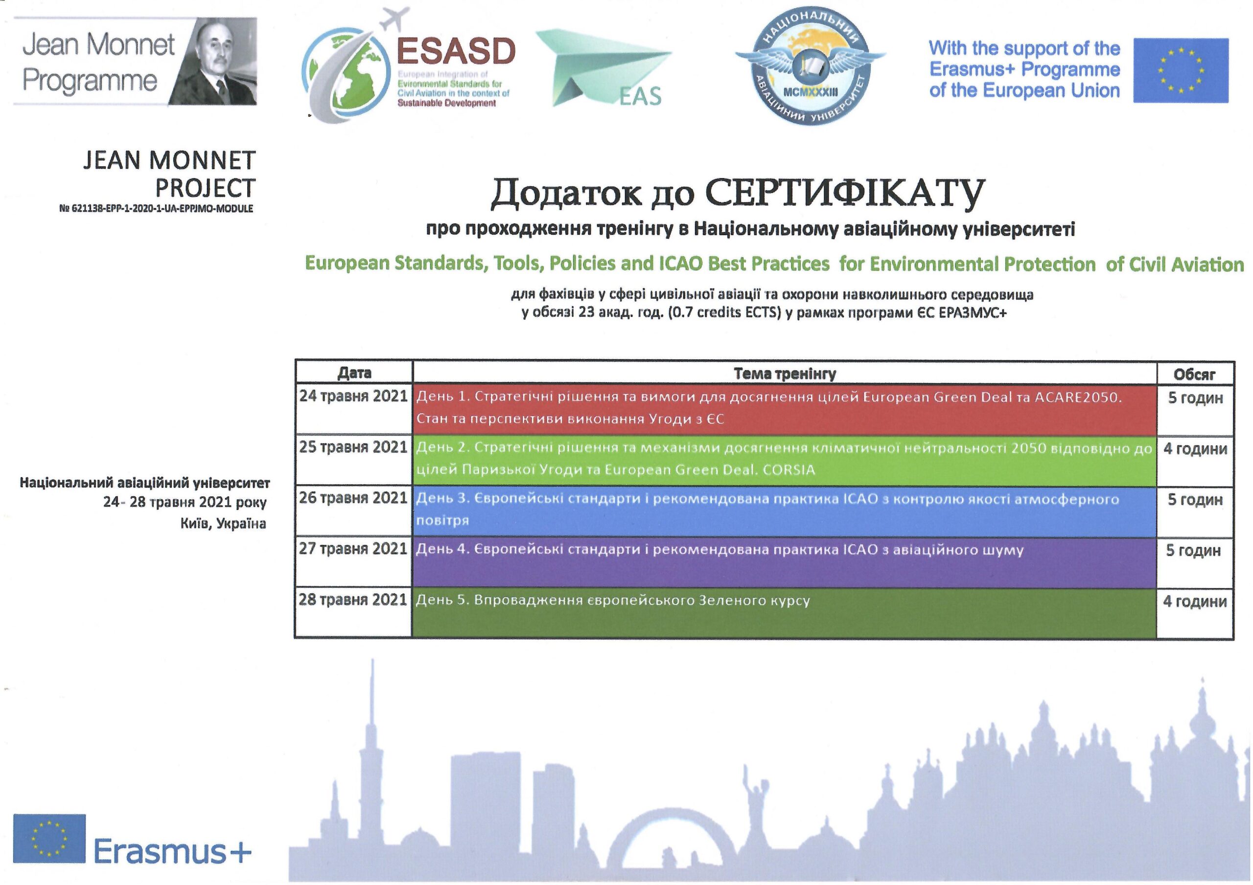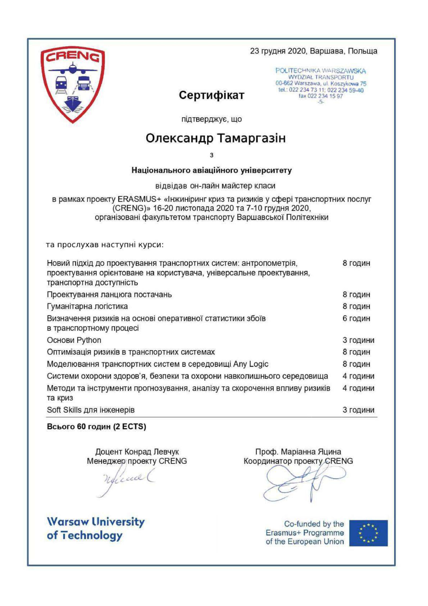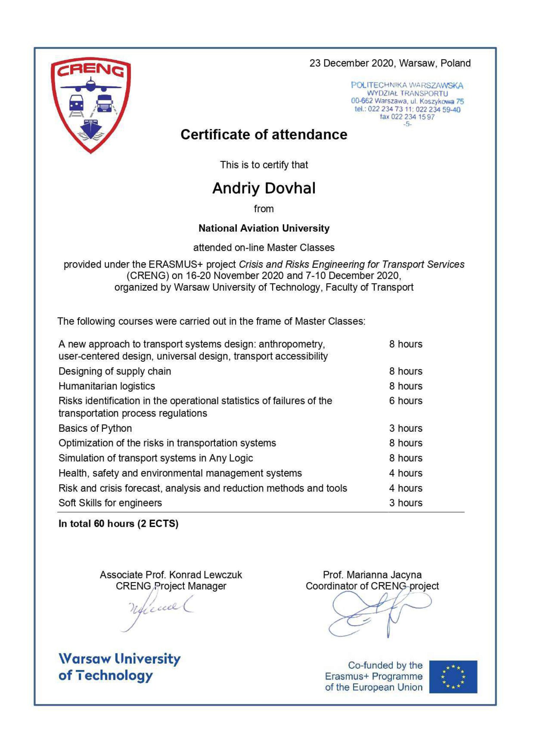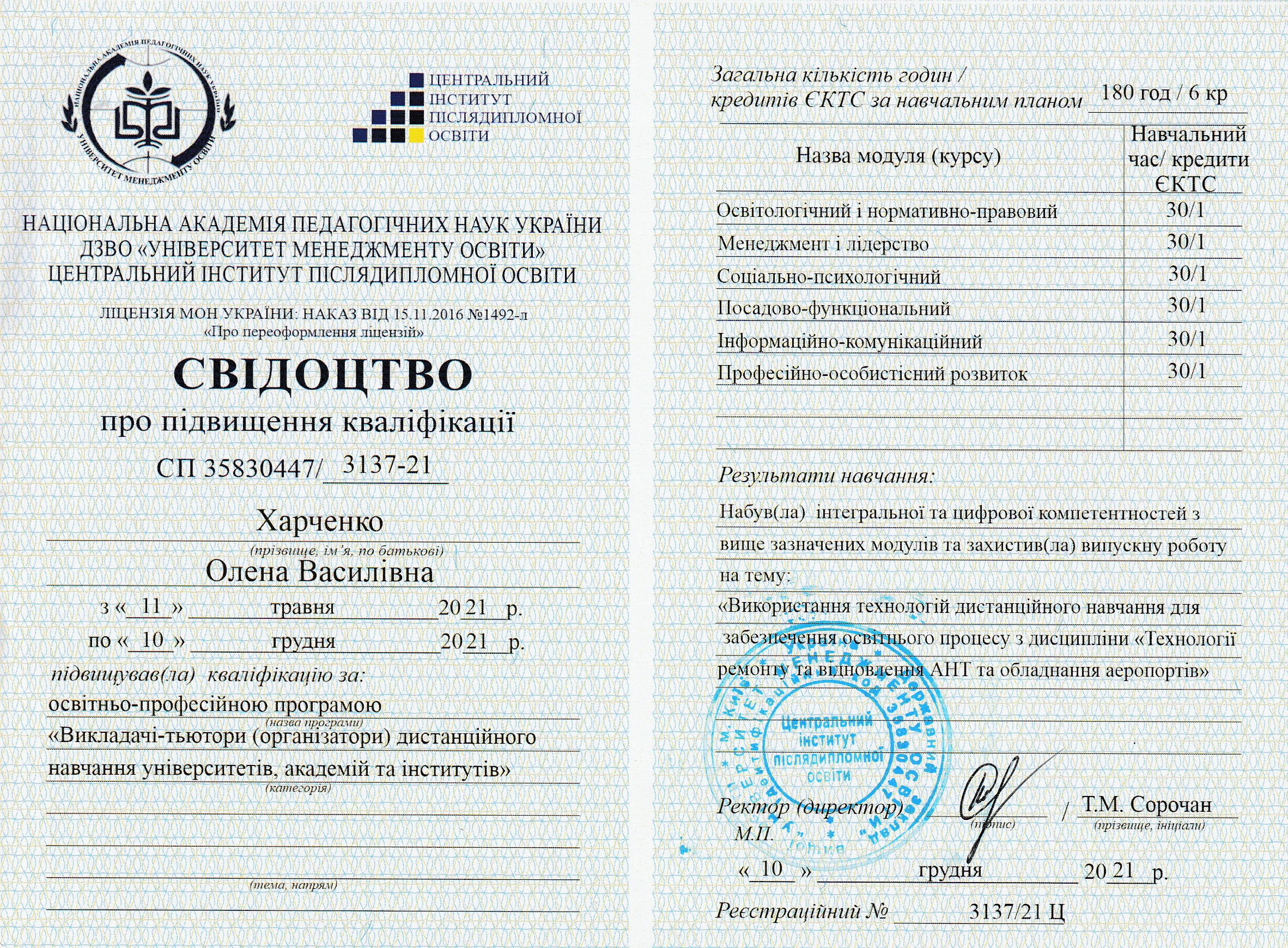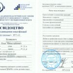 Отримав свідоцтво на право викладання англійською мовою у 2005 р., пройшов і успішно закінчив курс практичних тренувань за програмою «Технологій аеропортів та наземного обладнання» (компанія «Swissport Ukraine Ltd») у 2011 р., (компанія «Інтеравіа») 2015 р., (компанія Інтеравіа») 2019р., пройшов і успішно закінчив курс підготовки та отримав сертифікат «Внутрішнього аудитору системи менеджменту якості» (компанія «Bureau Veritas»), пройшов і успішно закінчив курс підготовки за програмою «Системи управління безпекою» в інституті ІКАО НАУ, пройшов і успішно закінчив курс підготовки «Інструктора» за програмою «Система управління безпекою» в інституті ІКАО НАУ, отримав сертифікат ICAO з авіаційної англійської мови, закінчив курс підготовки «Упровадження інформаційно-комунікаційних технологій та дистанційного навчання в освітній процес» в Національній академії педагогічних наук України в 2021 р.