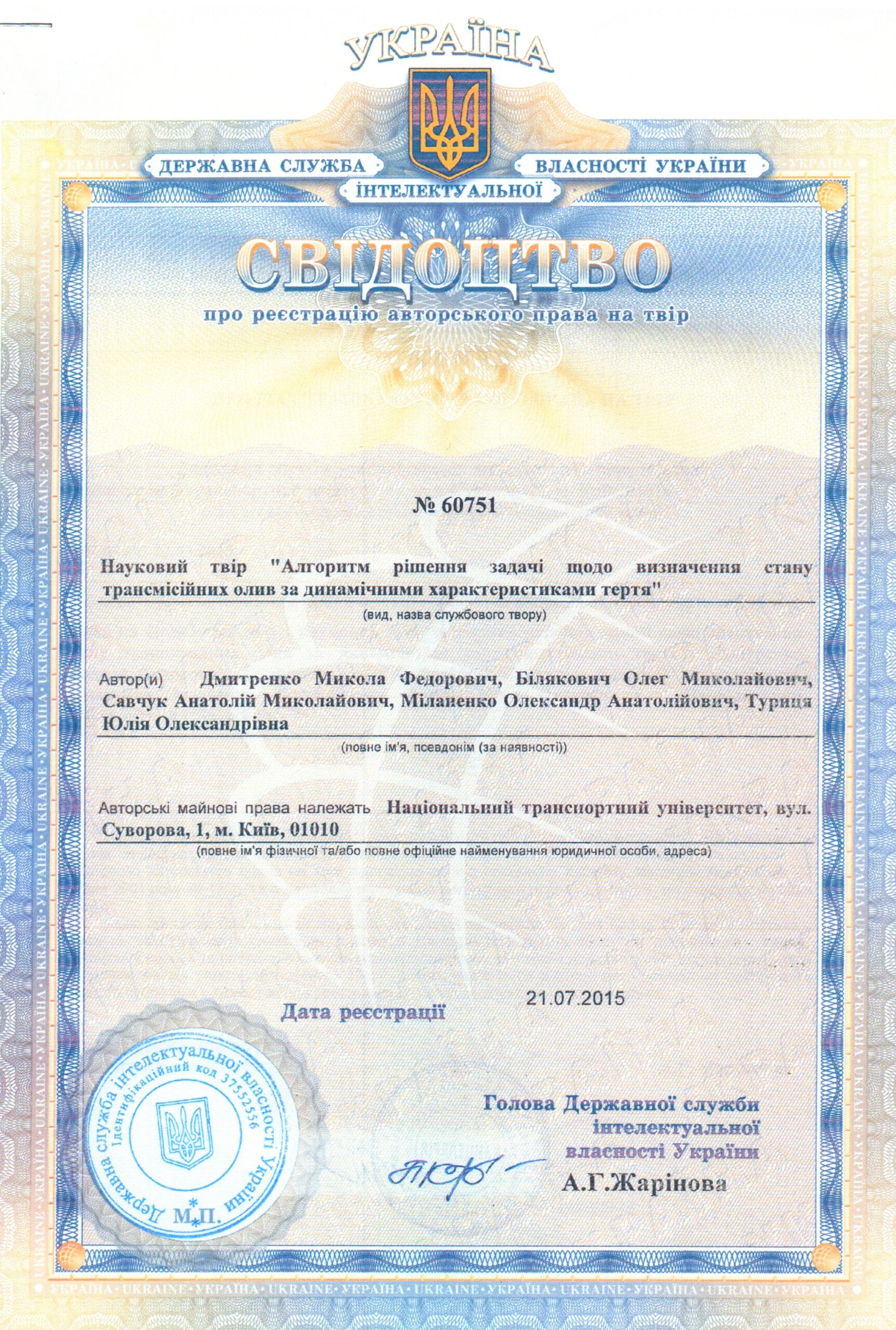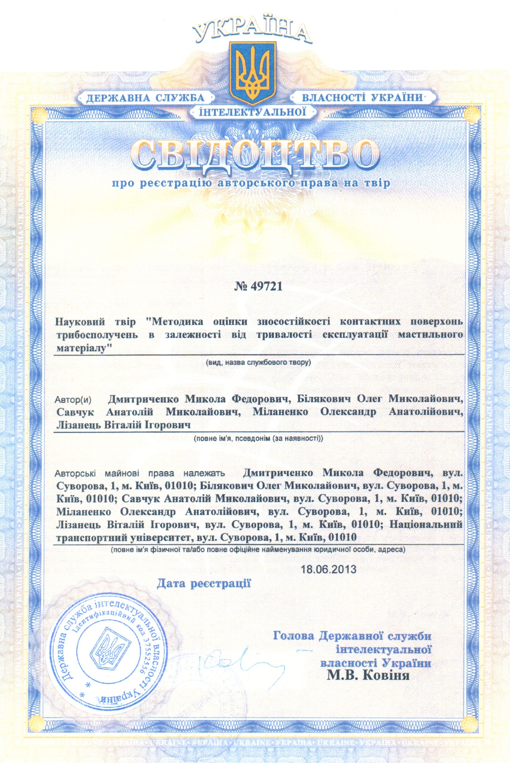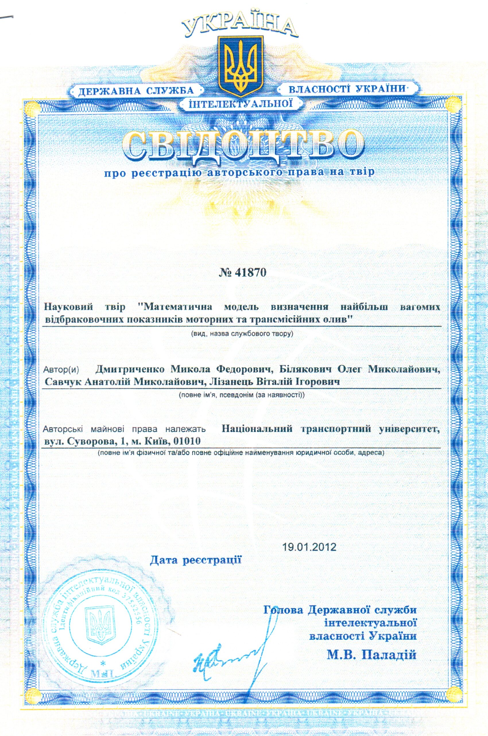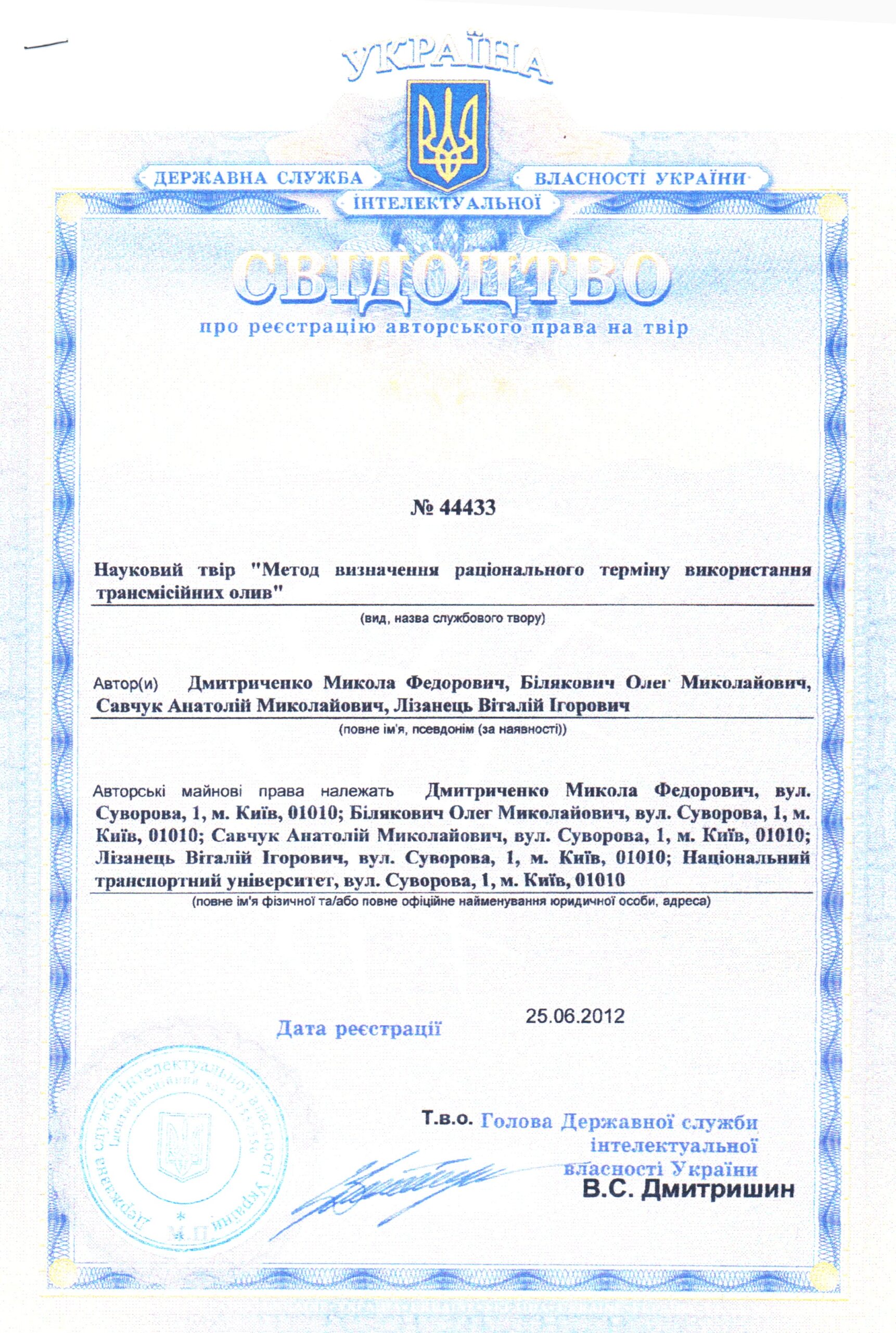 4.Dmitrichenko N.F., Bilyakovich O.N., Savchuk A.M., Mіlanenko O.A., Turytsia Yu.O.// Method of determination of transmission oils reasonable useful life / N.F. Dmitrichenko, O.N.Bilyakovich, A.M.Savchuk, O.A.Mіlanenko, Yu.O.Turytsia // Metallurgical and Mining Industry. – 2015. – №12. – S. 266-271.