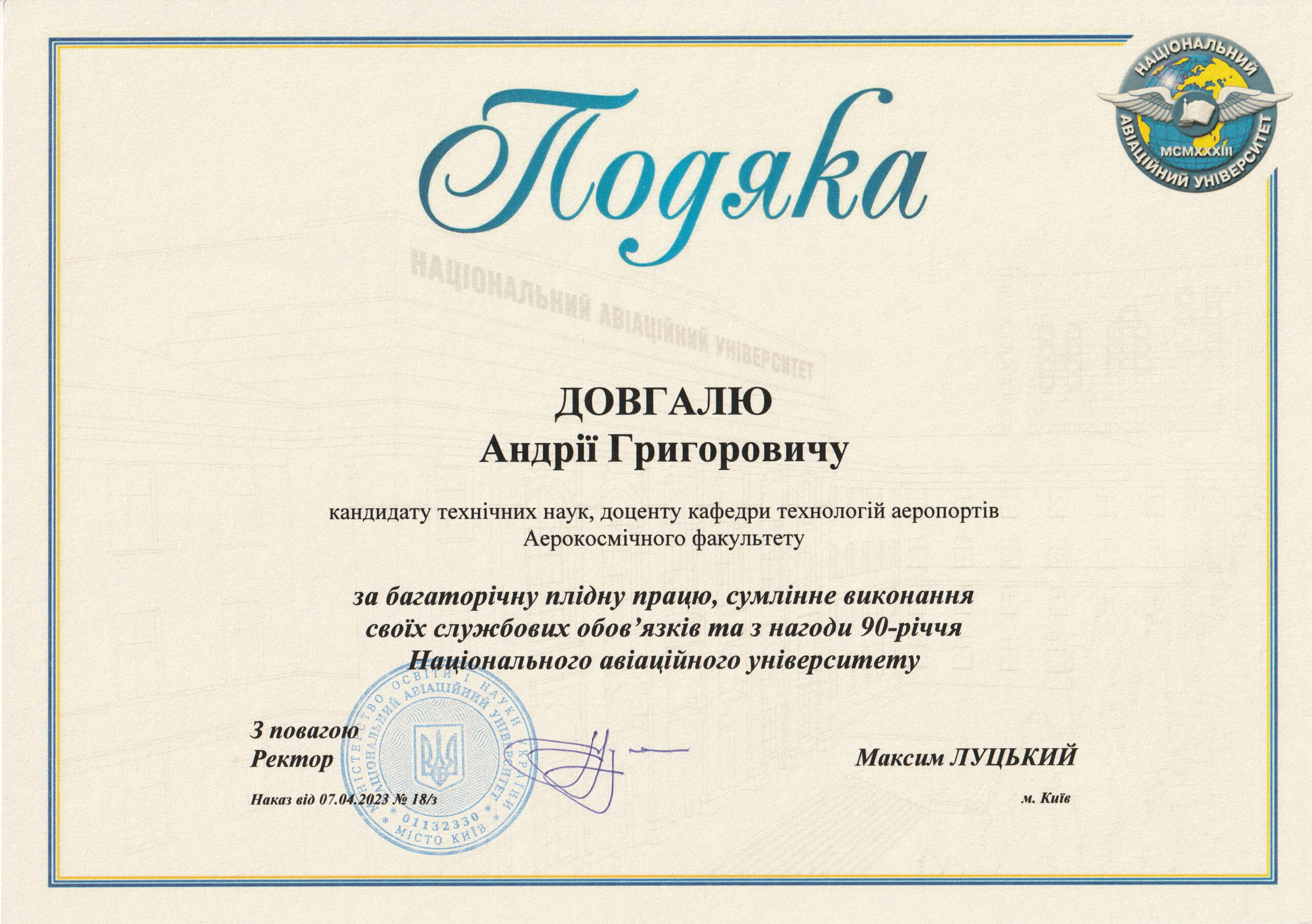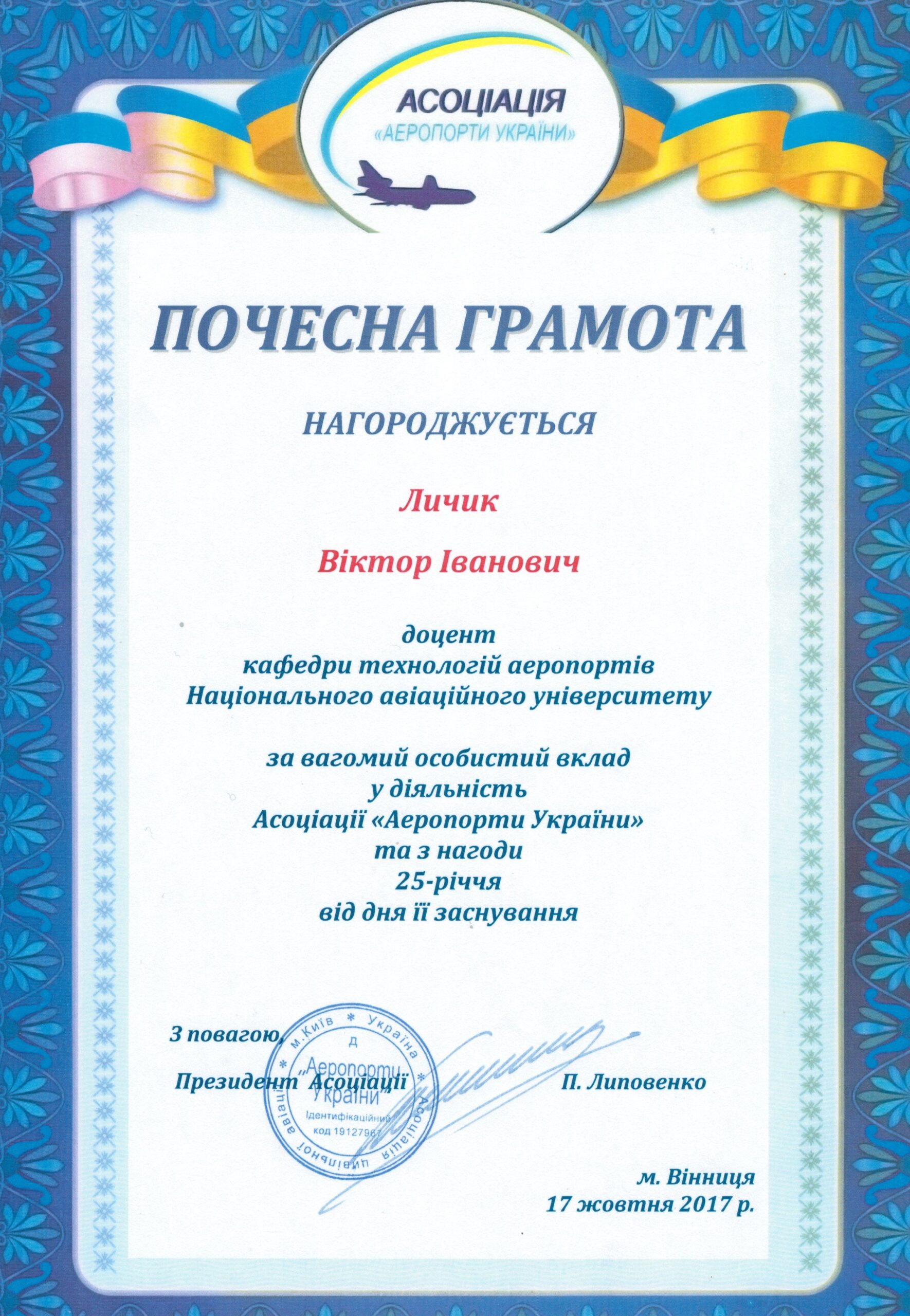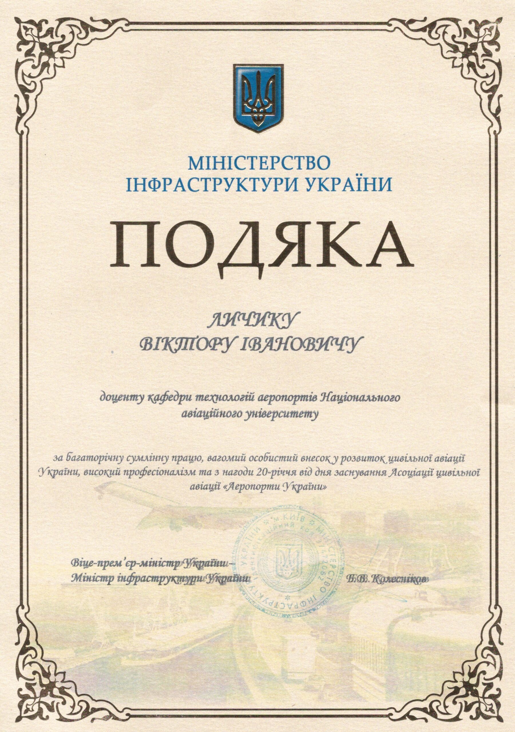 Отримав звання доцента кафедри технологій аеропортів 23.12.2011 р.