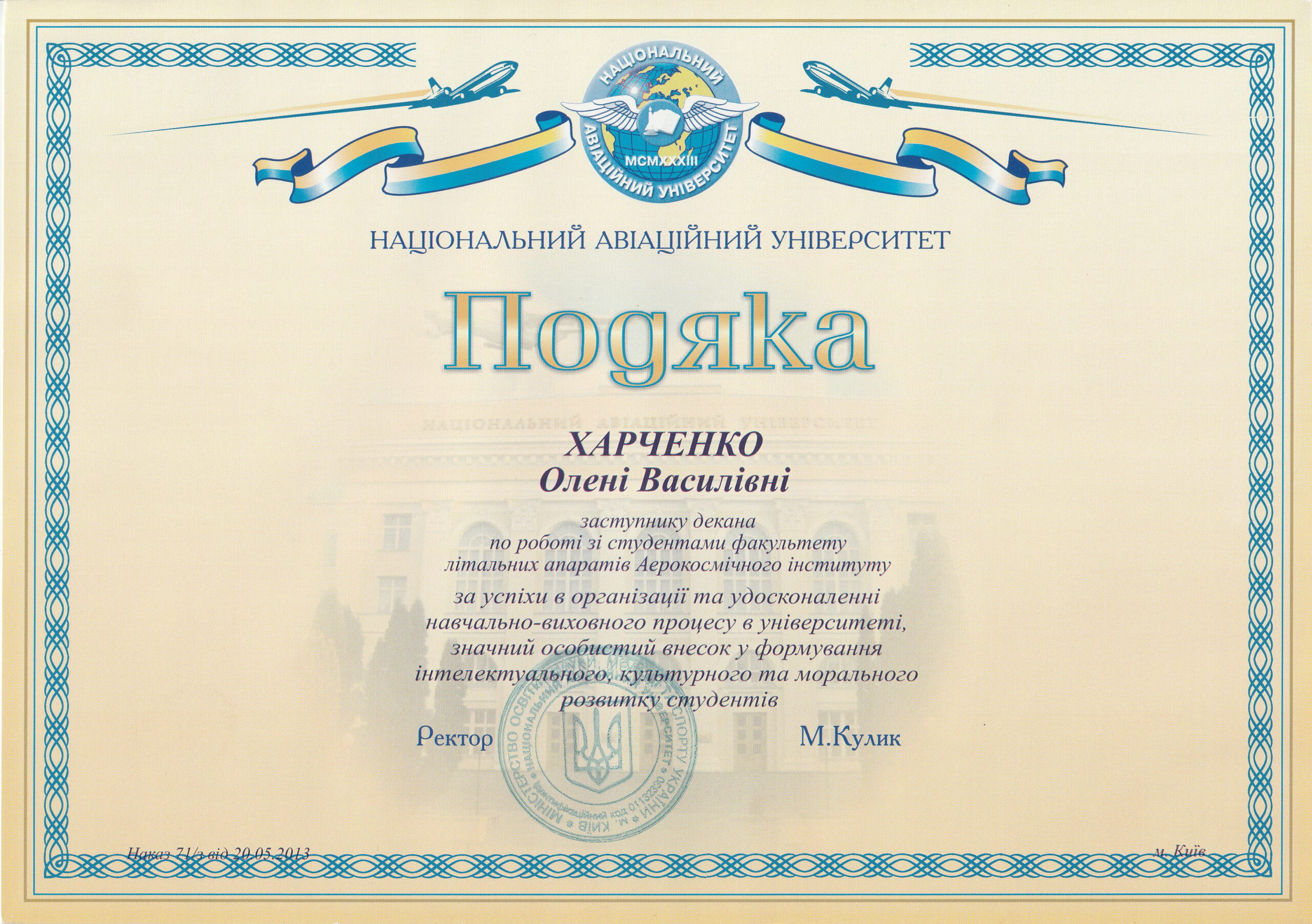 З 01.04.2019 р. – заступник декана аерокосмічного факультету НАУ.