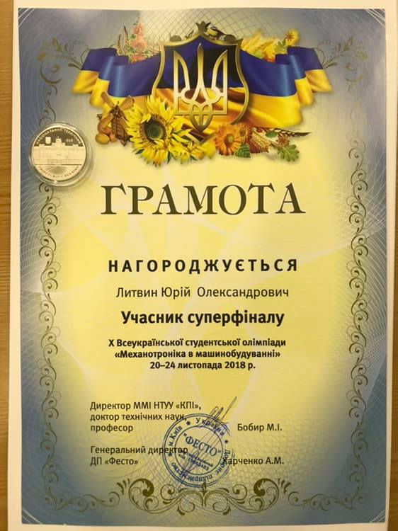 З 20 по 24 листопада 2018 року, в рамках 10-ї Всеукраїнської олімпіади «Механотроніка в машинобудуванні» на базі НТУУ «Київського політехнічного інституту» ім. І.Сікорського, велась активна змагальна боротьба поміж 17 команд студентів ВУЗів України. Команду Національний авіаційний університет представили студенти кафедри Гідрогазових систем (ГГС) НН аерокосмічного інституту в складі: Юрія Литвина, Максима Антошкіна, Марка Пушкіна та Андрія Рябова. Керівник команди – доцент кафедри ГГС Руслан Макаренко.