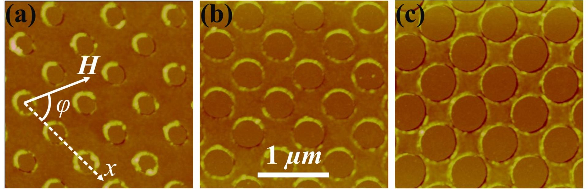 Зображення атомної силової анізотропії масивів дисків Ni80Fe20, з діаметрами дисків 300 нм (a), 425 нм (b) та 550 нм (c), покритих суцільною плівкою пермалою.