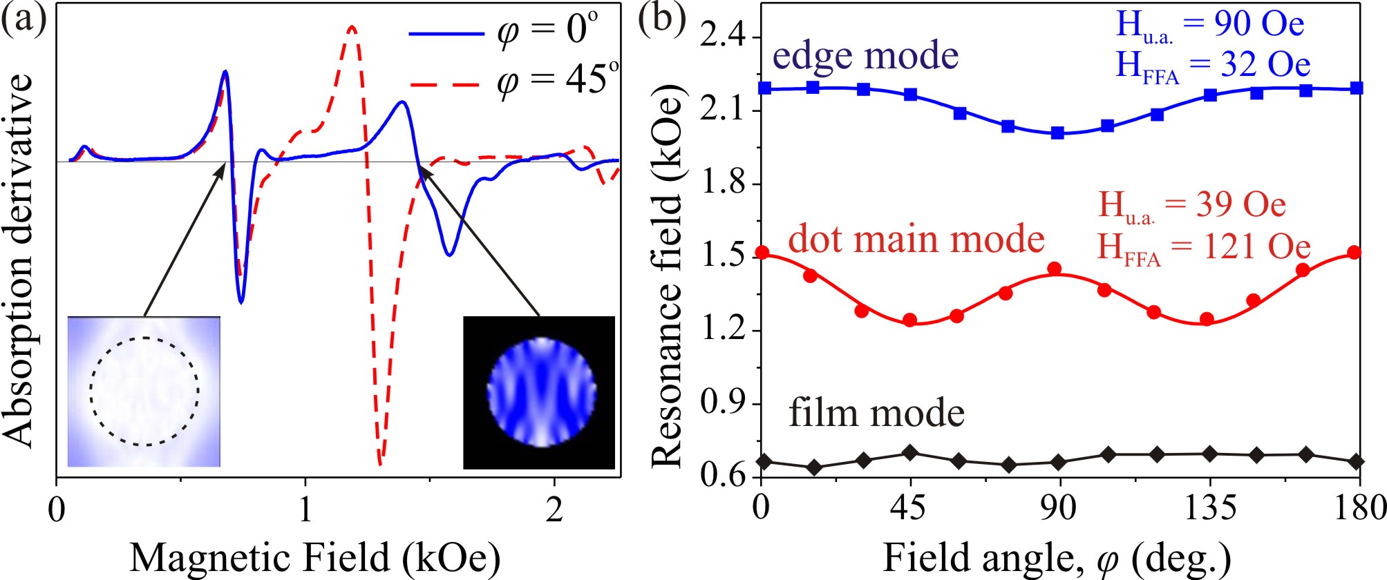 Спектр ФМР для структури з діаметром  дисків 425 нм та товщиною плівки 30 нм при різних напрямках поля. (b) – Кутова залежність резонансного поля для різних мод
