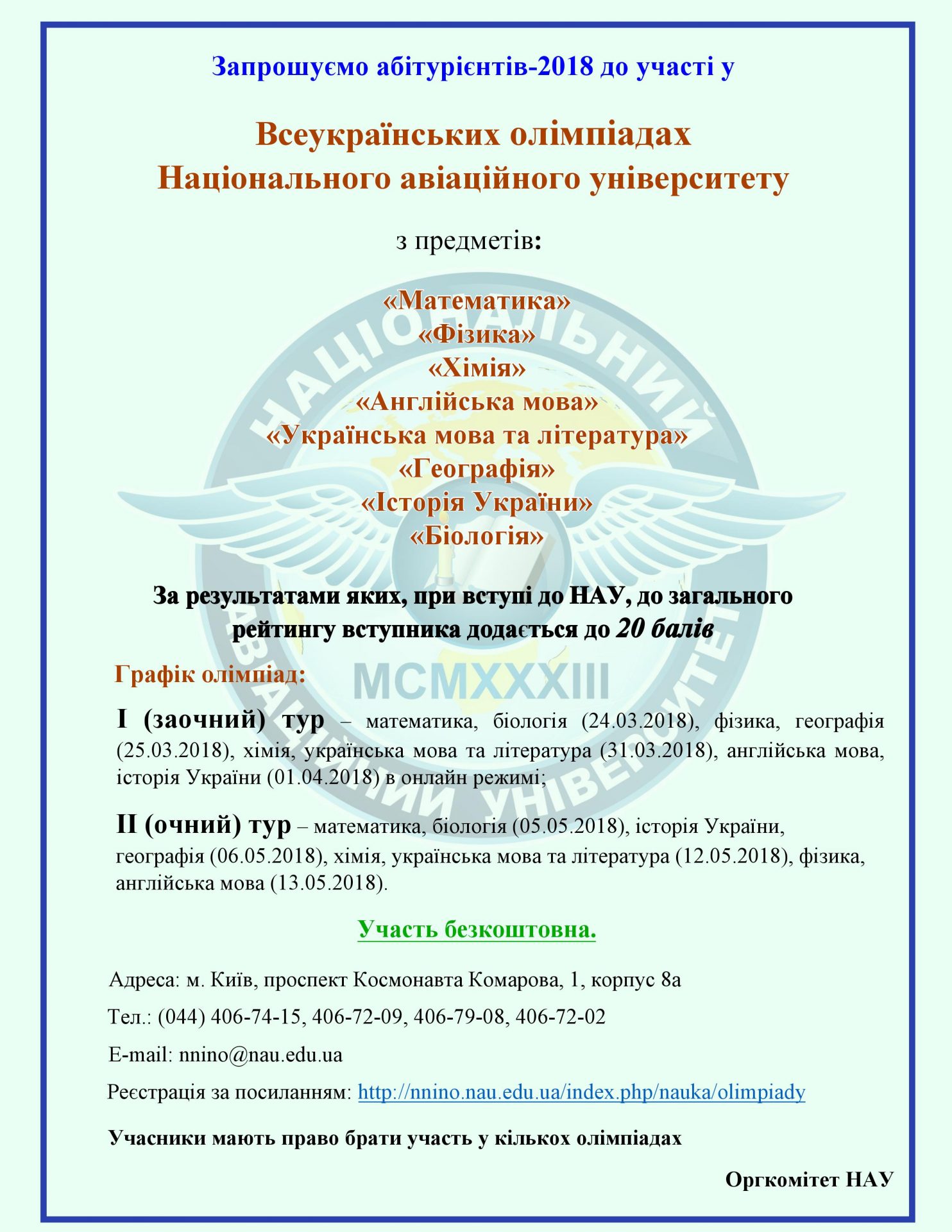Запрошуємо абітурієнтів-2018 до участі у Всеукраїнських олімпіадах НАУ