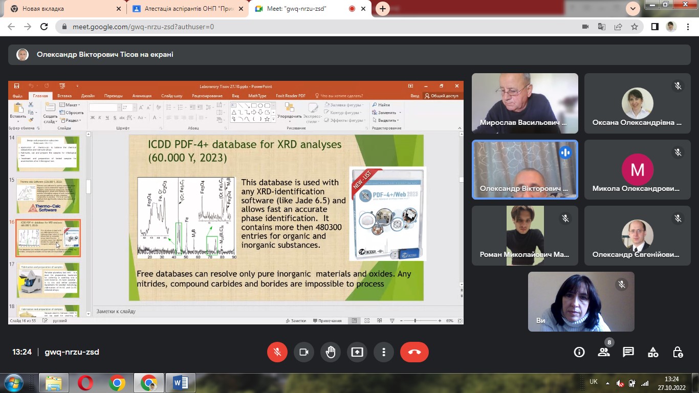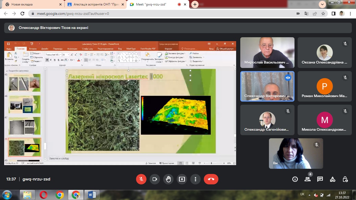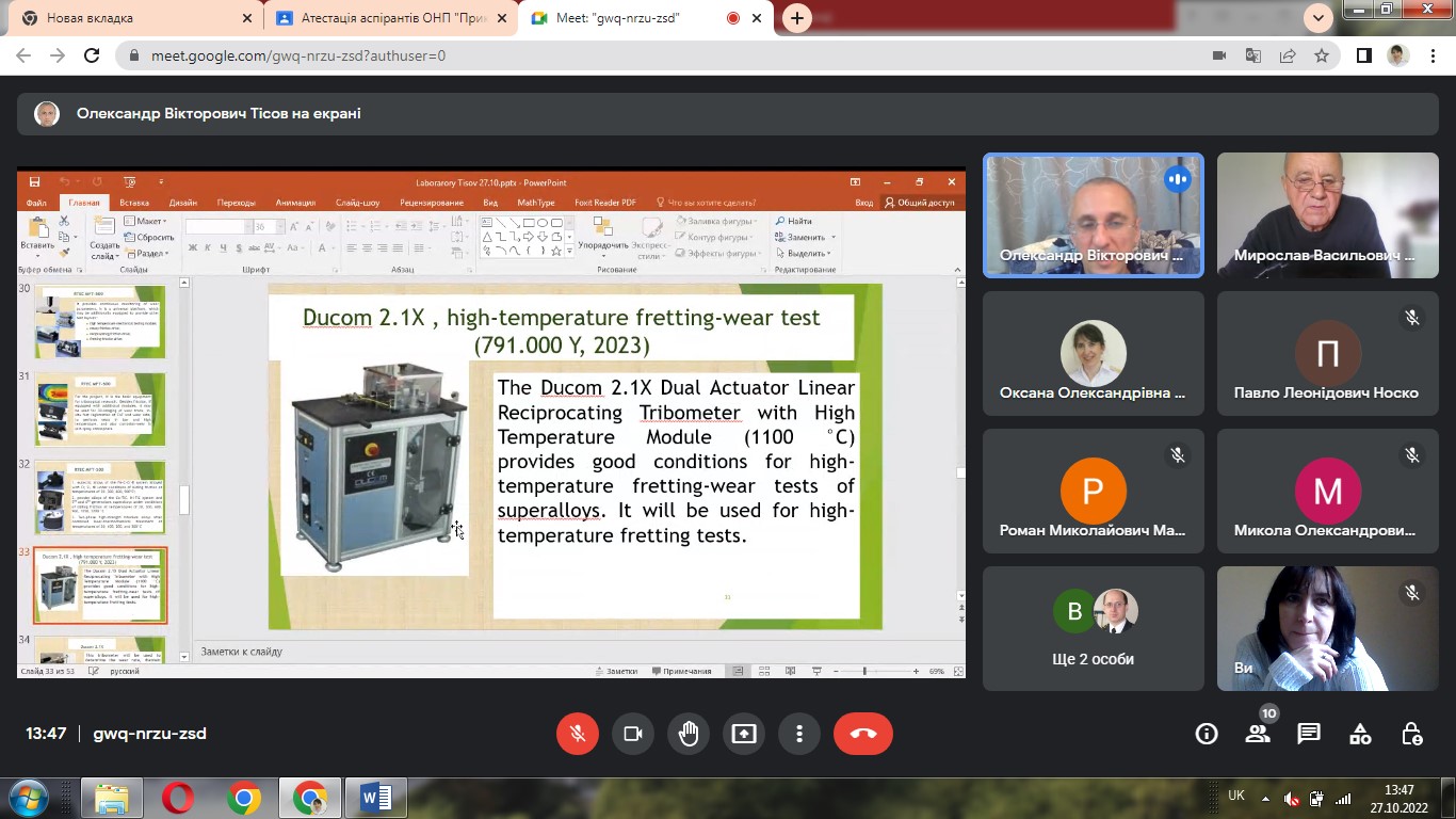 Доповідач представив сучасні технології виготовлення жаростійких сплавів на основі заліза та нікелю. Значна увага була приділена методам виготовлення сплавів, металографічним дослідженням з застосуванням лазерного мікроскопу. Обговорювались питання підвищення якості оцінки протизношувальних характеристик триботехнічних матеріалів, призначених для експлуатації в умовах високих температур, з застосуванням сучасних машин тертя, таких як високотемпературна машина тертя (діапазон робочих температур від 20 до 1200 0С) та установка для дослідження високотемпературного фретингу до 1100 0С.