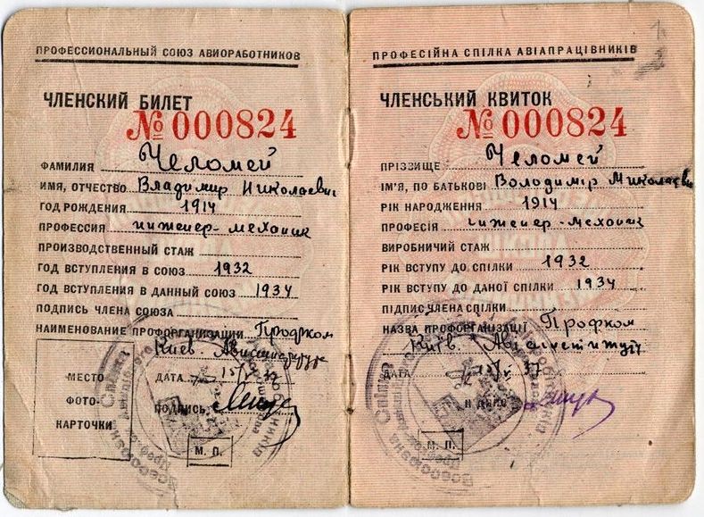 Зберігся членський квиток Володимира Челомея, виданий 15 травня 1937 року профкомом Київського Авіаінституту, який свідчить, що Володимир 1934-го року вступив до Професійної спілки авіапрацівників.